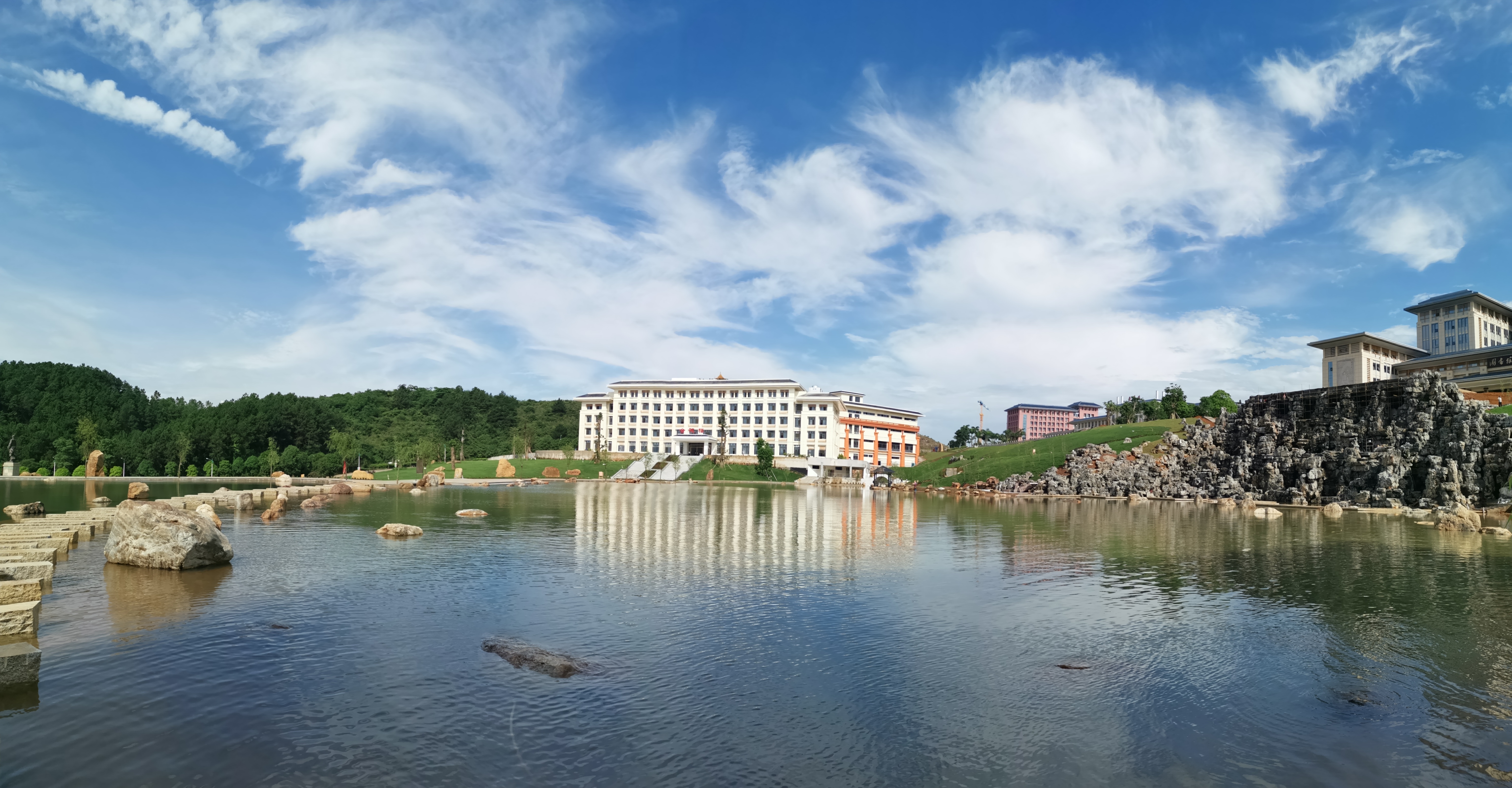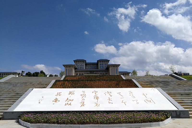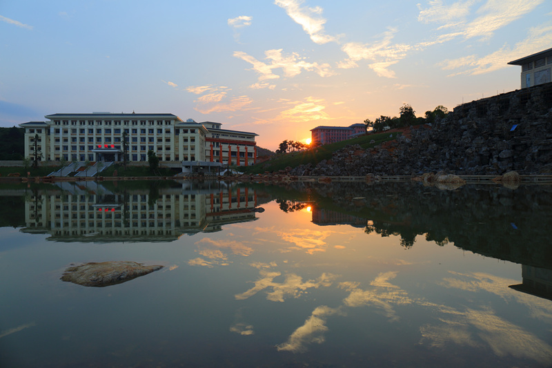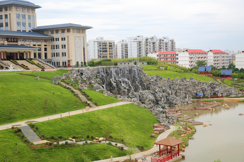 山水相依,文景相融。灵秀的自然美景与遒劲飘逸的书法相互交契,优美的校园风光和传统文化相互辉映,由内而外、天人合一,使得校园焕发出无限魅力。