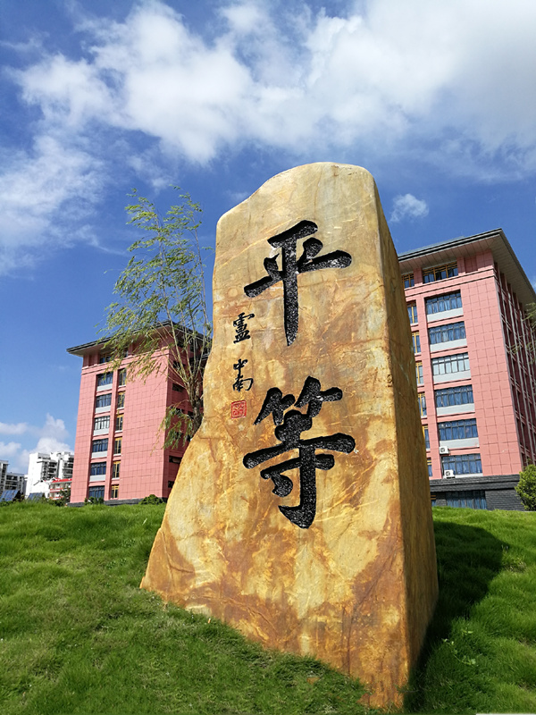 “平等”石刻位于阿平湖东侧,由楷书名家卢中南先生为点点体育题写。平等是人类社会理想境界的至高追求,也是社会主义核心价值观的基本要素,同时也是中华优秀传统文化人生观的共同理念。在学校空阔处耸立“平等”这样一块石刻是意味深长的,它意境上与相邻的“阿平湖”、“并育并行”、“天之道损有余而补不足”三石刻交相辉映,其“平等”二字还遥遥与远处“合德楼”主对联中的“碧碧湖水养慧心”的“慧心”二字密切相印,我们殷切期待着“平等”二字如同种子深深植入学子们的内心,潜移默化,最终使他们成长为身心健全的社会人。