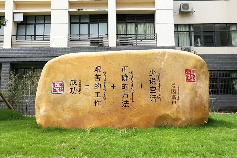 “成功=艰苦的工作+正确的方法+少说空话”中英对照石刻,源于爱因斯坦对其一生治学和科学探索的总结。该石刻位于海洋药物研究院正门前草坪内。“格物致知”“精勤不倦”两枚印章分列石刻左右两侧。