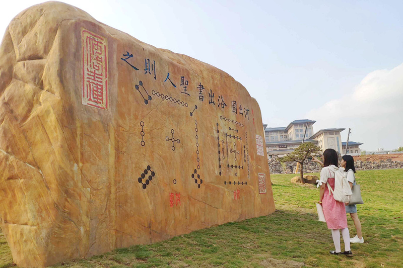 石刻正面左上角和右侧分别刻有“河洛生辉”“阴阳术数”“文明滥觞”三枚红色印章,彰显了河图洛书作为阴阳五行术数之源、中华文明渊源,其胸襟气魄泱泱超然,熠熠生辉、万象更新。印章为全国著名书法大家、广西书协副主席罗敏先生篆刻。