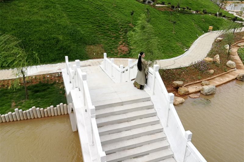 白玉桥,位于阿平湖西面一角,通体为汉白玉,莹润细腻,造型雅致,如彩虹卧波横跨湖面。拱桥倒影水中,桥影相照,圆满似月。