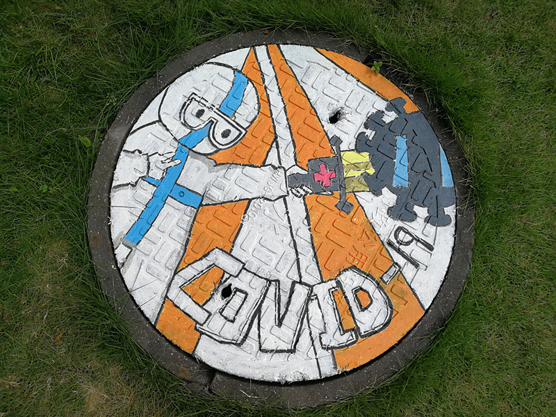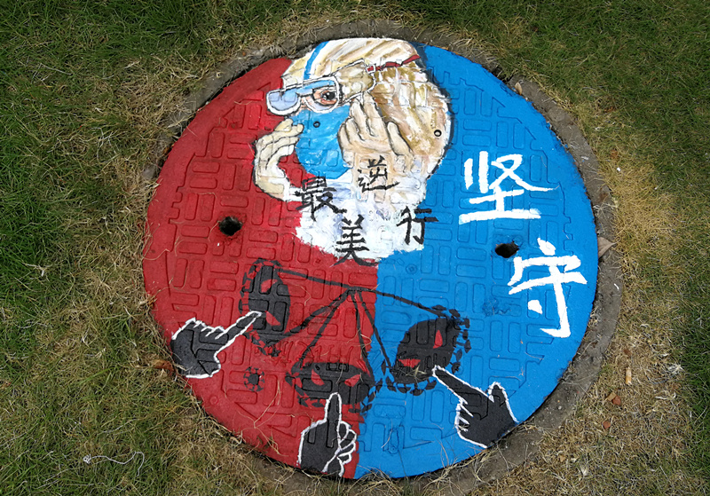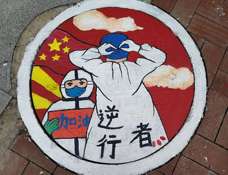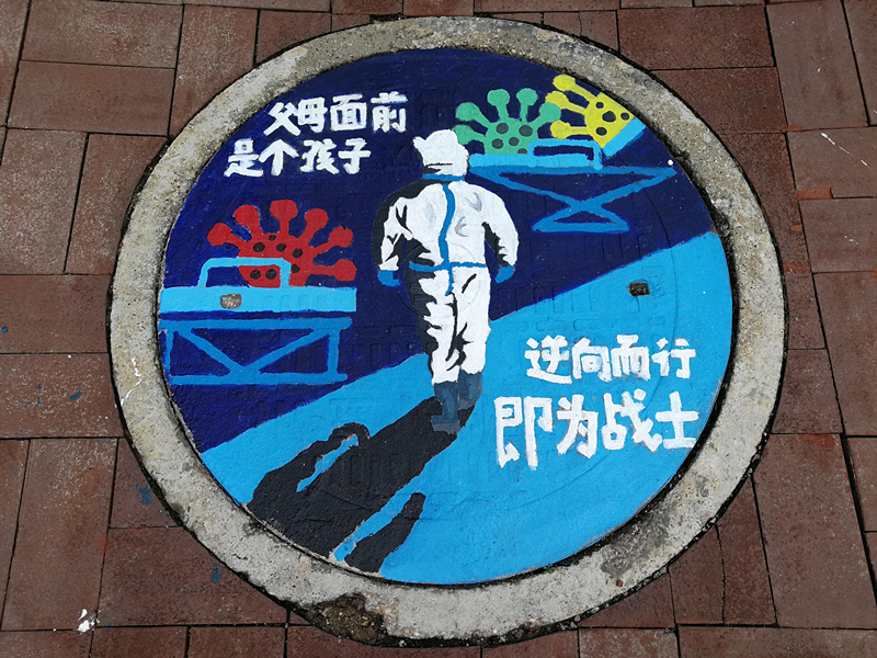 “素手慧心写丹青,彩笔井盖绘巧思。孩子们以井盖为布,青春为笔,情牵疫情,致敬最美逆行者!”一位老师在自己的朋友圈中写道。