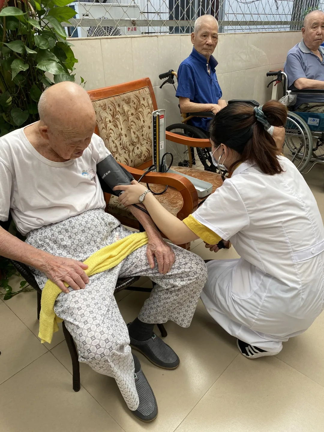 参加义诊的学生帮助老人们量血压