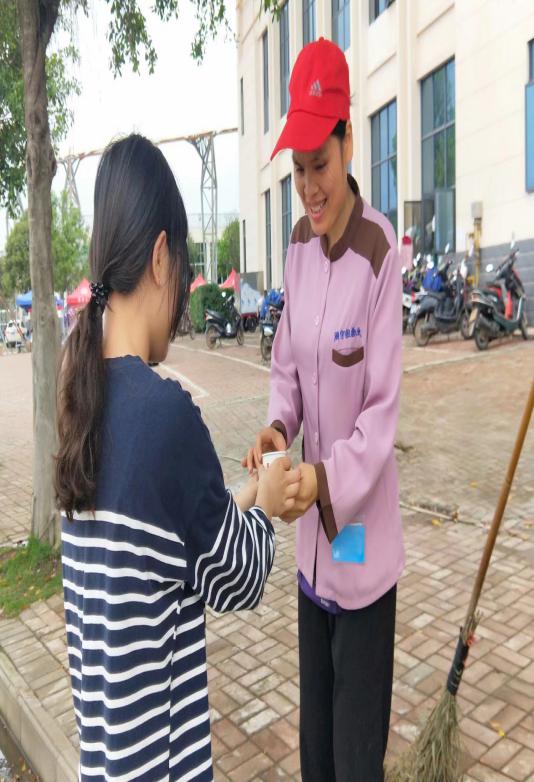 3月17日,班委事先要准备好此次活动所需物品,如罗汉果,热水,水壶,水瓶,一次性纸杯等,3月18日,将全班同学分为五组,每组7~8人,且各设负责人1~2名;活动开始前,大家在体育场集中,各班委小组长向组员传达活动注意事项,在送茶水时要确保每个同学文明礼貌,避免出现不文明行为,让每个劳务人员感受到真诚。活动开始时,将学校范围分为5块区域,每个小组去一个区域,确保全覆盖。到达指定地点后,每位小组长带领自己的组开展活动。