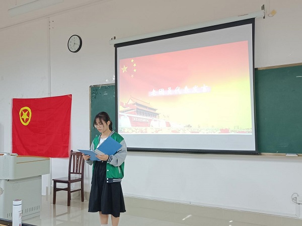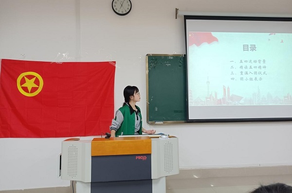 会上,团支书梁立梅以一个简短的视频向团员们介绍五四运动爆发的原因,让团员们对五四运动的时代背景有了初步了解;紧接着带领同学们学习“五四”精神的核心内容,以激发团员们的爱国热情和奋斗精神;随后带领团员们重温了入团仪式;最后通过小组朗诵、小组合唱和小组情景剧等形式为此次“五四”青年节献礼。
