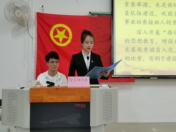 大会伊始,团支部全体成员齐唱团歌,由党支部代表组织大家一起学习“推优”知识。会上,推优对象何丽霞上台进行自我总结、表明加入中国共产党的决心,分享了一年来工作生活中的点点滴滴以及自己的大学生活感悟,并在现场的问答中紧贴时事发表自己的见解。本次大会本着公平、公正、公开的三大原则,成功为党组织输入了1位优秀人员。最后,何丽霞进行了表态:坚定信念、勤奋学习、创新进取、为党奉献一生。