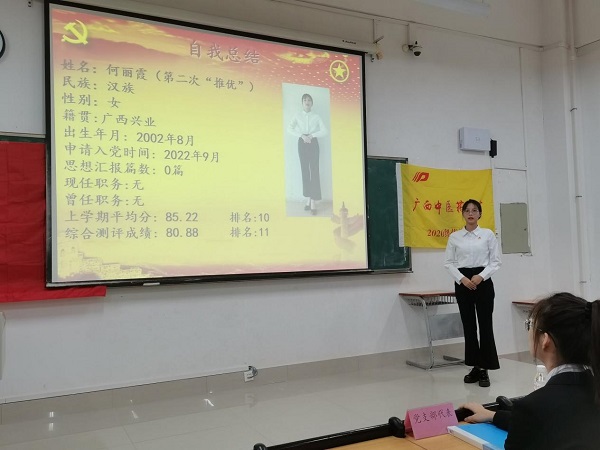 为向党输送新鲜血液,2020级药学4班团支部于9月25日下午在教学楼1-208教室召开了第四次推优大会。本次大会由团支书黄承鸿主持,出席的嘉宾有党支部学生代表黄慧、团委代表黄美婷。