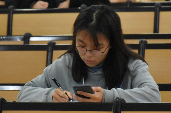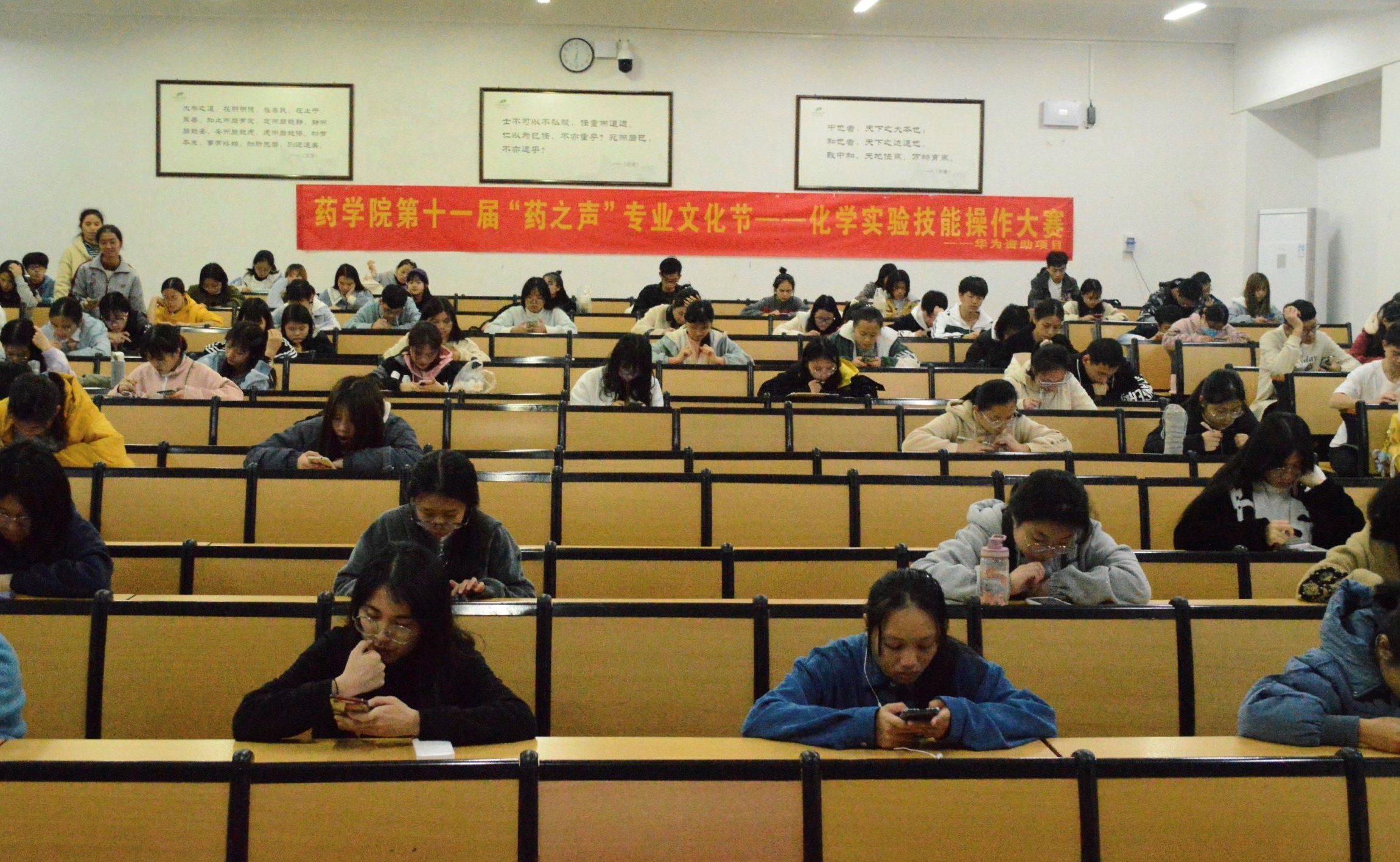 本次初赛总共1079名同学报名参加,以现场扫码线上考试的方式进行,考试内容主要包括无机化学、分析化学、有机化学实验等理论知识。考场上每一位参赛人员都有条不紊地进行答题,体现了同学们严谨的治学态度和深厚的知识底蕴,比赛氛围紧张而激烈,工作人员秉承着公平公正的态度,认真地维护着考场纪律。
