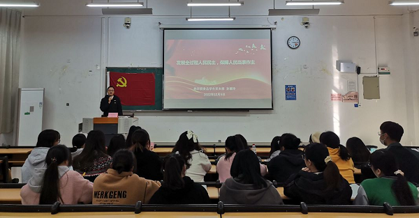 12月5日下午,药学院食品学生党支部书记孙慧玲在2-206教室给支部党员、入党积极分子等30余人讲授《发展全过程人民民主,保障人民当家作主》主题党课,党支部组织委员黄玉莹开场介绍。