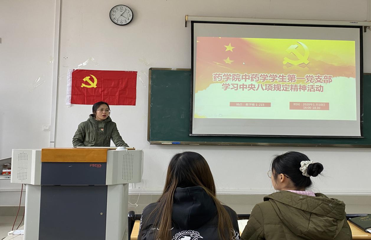 1月10日下午,药学院中药学学生第一党支部在仙葫校区教室1-215开展学习中央八项规定精神活动,支部全体党员、发展对象及积极分子参与此次学习活动,由刘佳同志主持,由雷煜婷同志领学。