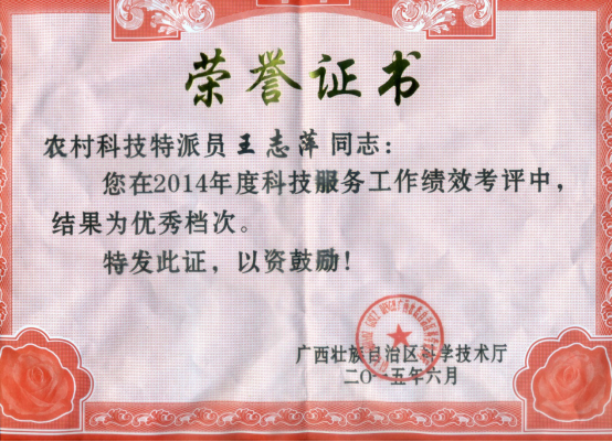 点点体育王志萍教授科技服务地方企业,荣获广西科技厅2014年度科技服务工作绩效考评优秀档次证书