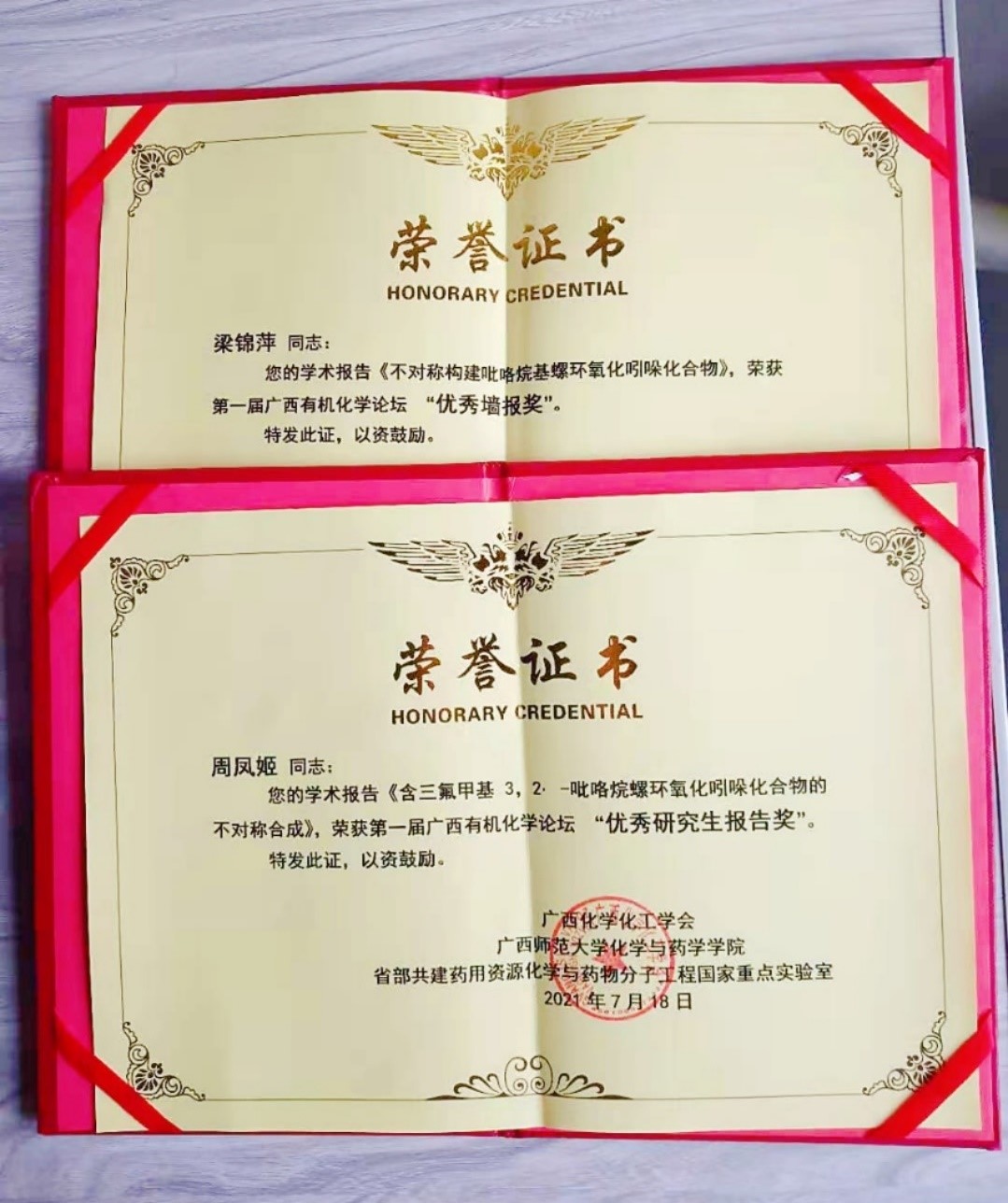2021年7月,药学院药物化学教研室主任林宁教授带领学生参加由广西师范大学承办的第一届广西有机化学论坛,并受邀做了“邮寄催化串联反应策略不对称构建螺环氧化吲哚”主题的学术报告。同行参会学生刘水丽、黄静玲和周凤姬3名研究生分别做了主题为《一例新型方酰胺构筑的金属有机框架在吲哚骨架化合物合成中的应用》、《脱氢枞酸衍生的方酰胺类化合物合成及其相关生物活性研究》及《三氟甲基3,2-吡咯烷螺环氧化吲哚化合物的不对称合成》的学术报告,何金芝和梁锦萍2名同学分别做了主题为《苯并二氢吡喃螺环氧化吲哚化合物的设计、合成及抗肿瘤活性研究》和《不对称构建吡咯烷基螺环氧化吲哚化合物》的墙报展示,其中,周凤姬和梁锦萍2位同学分别荣获“优秀研究生报告奖”和“优秀墙报奖”。向广西师范大学的师生及参会其他高校(清华大学、广西大学、赣南师范大学、广西民族大学、桂林电子科技大学、南宁师范大学、五邑大学、桂林医学院等)展示了taptap点点体育药学生的创新科研能力。