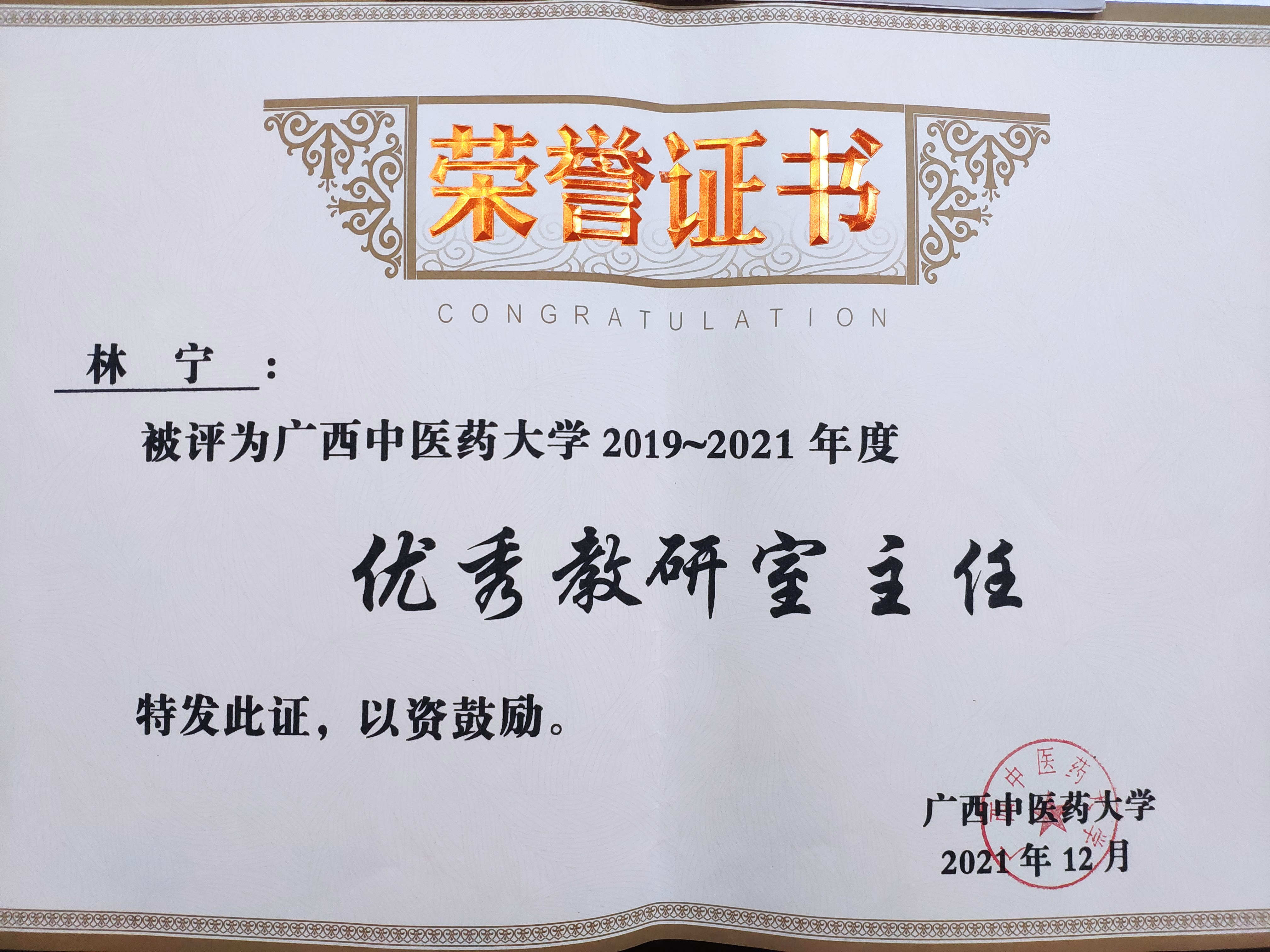 根据《taptap点点体育开展 2019~2021 年度教研室主任、秘书考核及优秀教研室主任、秘书评选工作的通知》( 桂中医大教务〔 2021〕 350 号) 要求, 为切实加强教研室在履行大学职能中的作用,进一步加强教研室管理人员队伍建设, 规范教研室“四化”建设工作,充分调动基层教学管理人员的积极性,在“公平、公正、公开”的基础上,经各学院、教学部推荐,学校组织专家民主评议, 经学校校长办公会审议,药学院药物化学教研室主任林宁教授被评为点点体育 2019~2021 年度优秀教研室主任。