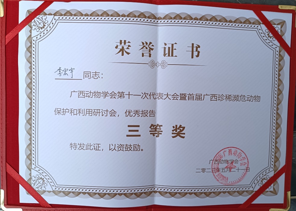 5月21日,广西动物学会第十一次代表大会暨首届广西珍稀濒危动物保护和利用研讨会在广西梧州学院召开。药学院中药鉴定学教研室黄勇老师带领课题组成员参加了此次大会,2021级硕士研究生李宏宇做了学术报告并获优秀报告三等奖。