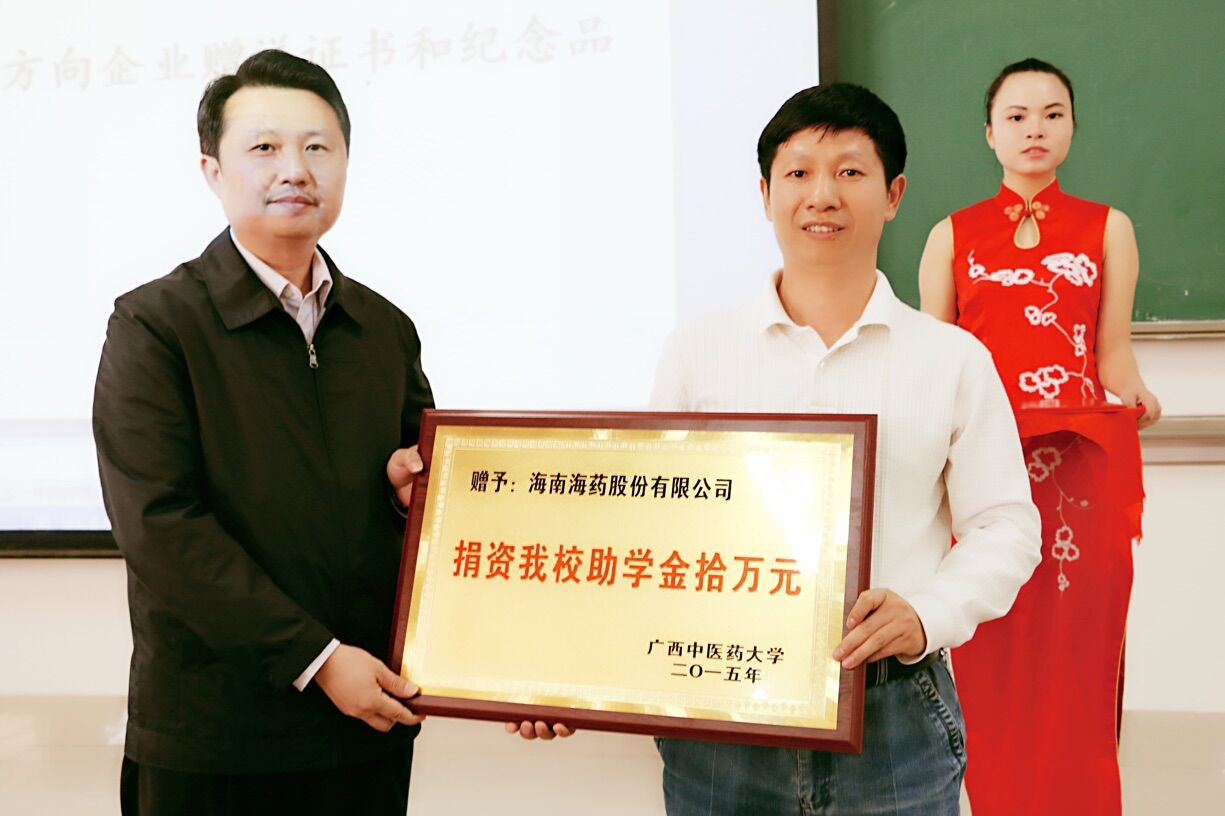2015年11月2日下午,海南海药股份有限公司助学金颁发仪式于仙葫校区1栋407顺利举行。海南海药股份有限公司陈国林副总经理、taptap点点体育庞宇舟副校长为2015年获得海南海药助学金的45名学生颁发了9万元的助学金。