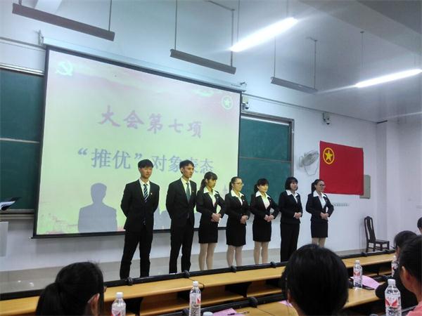 大会在全体人员起立合唱团歌后正式拉开帷幕,大会伊始,药学院党支部代表组织同学们认真细致地学习了“推优”知识,让大家对“推优”有了进一步的了解。随后便进入大会的重要环节——审议“推优”对象。参与“推优”的对象对自己进行了总结评价,展示了自己的政治思想路线并详细说明加入中国共产党的原因。总结结束,团支部成员与“推优”对象进行了现场问答,团支部成员提出的问题紧跟时代焦点政事,“推优”对象回答得全面,简洁明了,紧抓重点。随后进行民主评议及民主表决。在团支部代表进行公证的情况下,主持人宣布了投票结果,随后“推优”对象对评审意见进行表态和反思。最后,管海钦老师和李豫萍老师对本次大会进行了点评。李豫萍老师表示,“推优”是大学中团支部向党支部推荐优秀人才的主要途径,并对在今后着重参与“推优”的对象及工作人员提出了要求。同时管海钦老师表示此次会议对于2014级和2015级的同学是一个非常好的学习机会,希望2014级和2015级的同学能够好好学习并且学以致用,认真准备以后的“推优”工作。