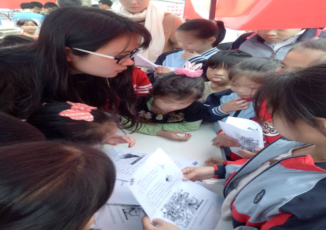 药学院志愿者给小朋友发放宣传单,现场讲解预防流感知识