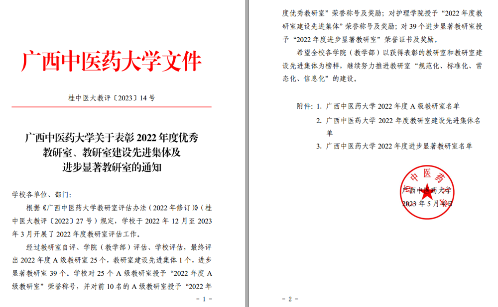 根据《taptap点点体育教研室评估办法(2022年修订)》(桂中医大教评〔2022〕27号)规定,学校于2022年12月至2023年3月开展了2022年度教研室评估工作。