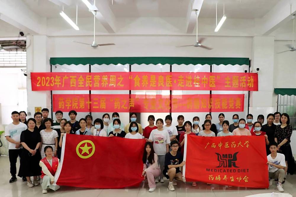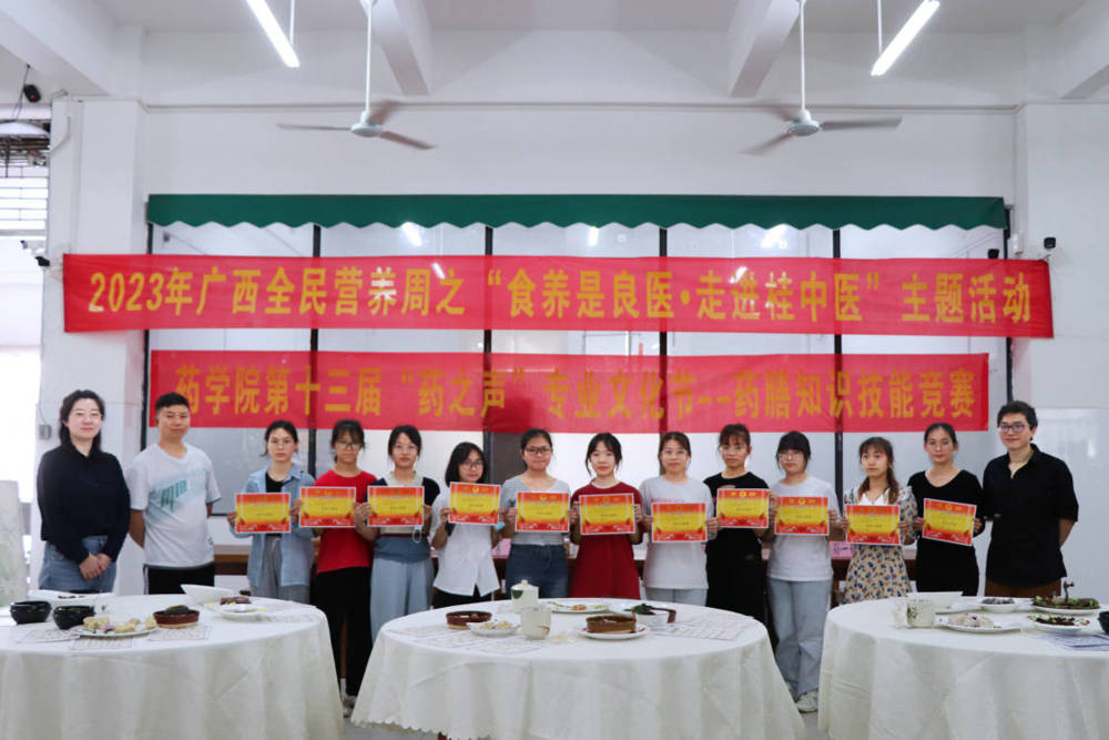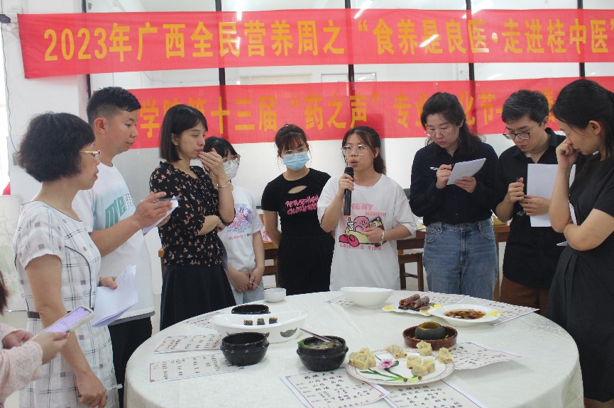 5月21日,药学院第十三届“药之声”专业文化节——药膳知识技能竞赛暨2023年广西全民营养周之“食养是良医•走进桂中医”主题活动于仙葫校区五合食堂落下帷幕。出席嘉宾有院党委李豫萍副书记、药学院团委黄鑫老师、食品科学系主任谭强教授、基础医学院学办杨丽琴主任、学校团委王雄将老师等。李豫萍副书记致辞希望参赛队员以药膳比赛为契机,加强中医药膳文化学习及推广应用,通过“以赛促教”、“以赛促学”普及中医传统食养知识与药膳技能,促进点点体育各专业教育、思想政治教育与创新创业教育的深度融合。现场评审由易蔚教授、谢艳林主任、陈卫卫教授、周蓓教授、娄兵厨师长、孙一铭博士、陈豪博士组成。