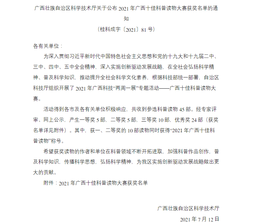 我院获2021年广西十佳科普读物大赛奖项1项