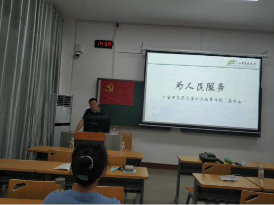 2020年6月19日下午,针灸推拿学院党总支在明秀校区时珍楼104教室举行了党课专题讲座,学院党总支副书记、院长范郁山教授以《为人民服务》为主题进行讲解,学院教工支部、部分学生党员及入党积极分子参加了此次讲座。