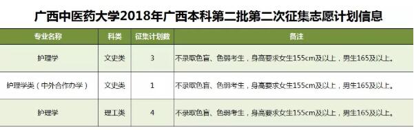 2018年征集志愿-广西本科第二批(第二次征集) 发布时间:2018-07-26 19:47:49 浏览次数: 次 【字体:小 大】 点点体育此次将征集护理学,护理学类(中外合作办学)等专业计划共8名,详情如下: 请考生填报志愿前务必确认身高条件符合专业要求,避免被退档。 征集志愿填报时间:7月27日18时至7月28日9时,请考生在规定时间内进入广西招生考试院官网(http://www.gxeea.cn)“2018年普通高校招生志愿填报”填报征集志愿,并保证在征集志愿填报、投档及录取期间保持报名时所留联系电话畅通。详情请点击“征集志愿”。 分享到: 【打印正文】