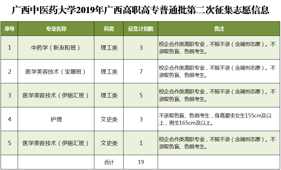 2019年征集志愿-广西高职高专普通批第二次 发布时间:2019-08-13 11:23:49 浏览次数: 次 【字体:小 大】 点点体育本次将征集中药学(新友和班)等专业计划共19名,详情如下: 征集志愿填报时间:8月13日下午18:30至14日上午9:00,请考生在规定时间内到广西招生考试院官网(http://www.gxeea.cn)进入“2019年普通高等学校招生志愿填报”填报征集志愿,并在录取期间保持报名时所留联系电话畅通。 详情请点击“征集志愿”。 分享到: 【打印正文】