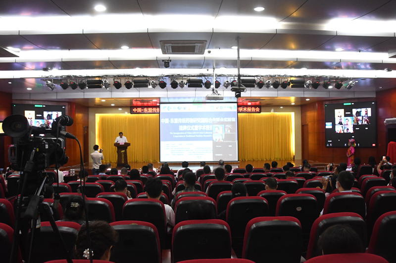 自治区科技厅副厅长蹇兴超、对外交流合作处处长汪靓,自治区中医药管理局副局长张玉军、科教处副处长杨艳光,taptap点点体育副校长冷静、戴铭,中国工程院院士刘昌孝,广西中药药效研究重点实验室主任邓家刚,南开大学教授白钢,天津药物研究院研究员张铁军,广东药科大学教授王淑美,中国科学院长春应用化学研究所研究员宋凤瑞,新加坡、泰国、马来西亚、老挝、柬埔寨等5个国家的中国--东盟传统药物研究国际合作联合实验室成员,学校各部门领导、教师、学生代表以及企业代表等近300人现场参会,线上16位东盟国家专家学者共同见证了中国-东盟传统药物研究国际合作联合实验室的成立。揭牌仪式由戴铭主持。