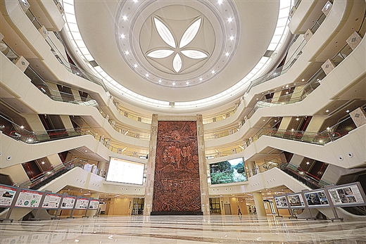 门诊大厅上方跨度36米的绣球吊顶,是目前世界最大的绣球,目前已经开始申报世界吉尼斯纪录;在门诊四楼的民族医药诊疗服务区域,左右对称设计了两幅壮医药发展的长卷,遴选了壮医药发展长河中的重要事件、重要人物,展示壮医药文化,普及壮医药知识……