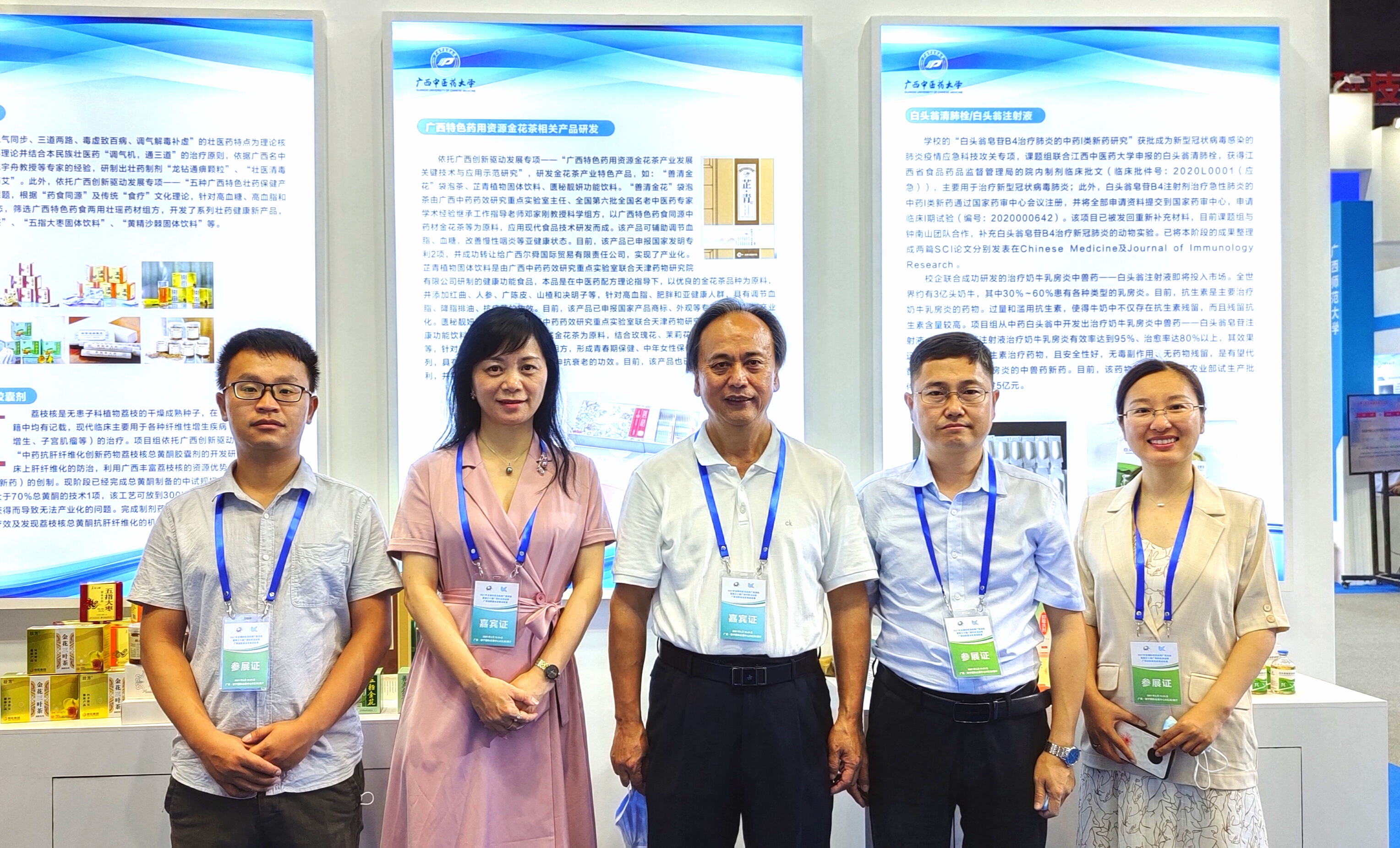 实验室主任邓家刚教授牵头承担的广西创新驱动发展专项“广西特色药用资源金花茶产业发展关键技术与应用示范研究”,联合桂港澳津等4个国家重点实验室和2家企业集团,对金花茶全产业链的关键技术进行系统研究,项目取得了系列科研成果。在高校院所展区,重点展示了项目开发并转化上市的善清金花袋泡茶、芷青植物固体饮料、匮秘靓妍功能饮料等系列健康产品。