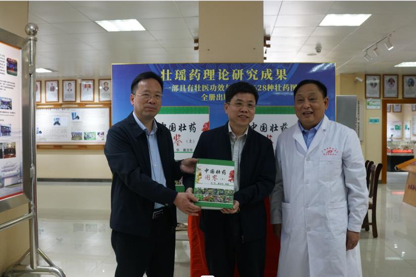 莫锦荣书记与朱华教授代表壮瑶药研究平台赠予壮瑶药理论研究成果-朱华、戴忠华《中国壮药图鉴》,该著作是第一部具有壮医功效与主治1628种壮药图鉴,该著作获第二十六届中国西部地区优秀科技图书一等奖。