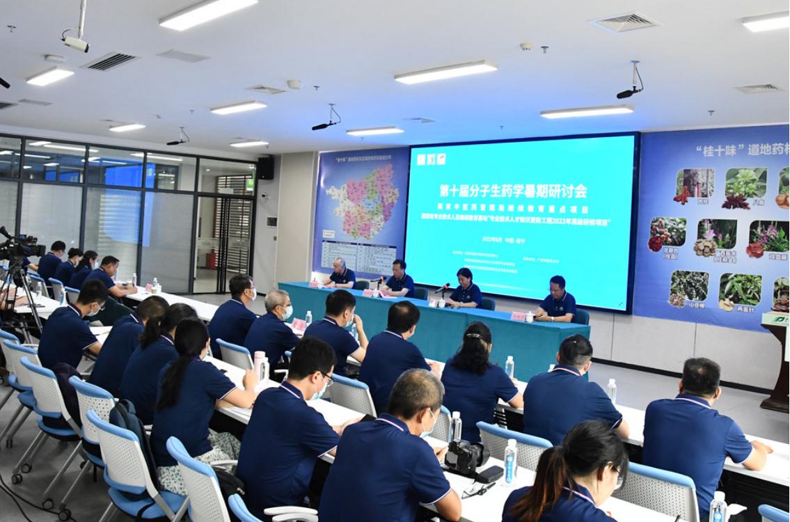 莫锦荣在致辞中向与会专家简要介绍了学校的办学历程及办学理念。莫锦荣表示,学校高度重视分子生药学学科的发展,组建了学科团队,搭建了中医药研究系列平台,在理论研究及广西中药资源开发利用等方面发挥了重要的促进作用。黎甲文在致辞中介绍了自治区党委、政府为推进中医药发展所制定的政策以及广西丰富的中医药民族医药资源。中国中医科学院教育处处长马堃,中国中医科学院中药资源中心副主任、中国中西医结合学会分子生药学专业委员会副主任委员袁媛先后在开幕式致辞,表达了对会议的支持和期待。在大会特邀报告中,黄璐琦以“分子生药学进展”为主题,围绕分子生药学的学科建设、研究进展、未来方向等三个方面为与会嘉宾作报告。姚春在题为“‘桂十味'道地药材资源及产业发展策略”的主题报告中,介绍了“桂十味”的产业背景、资源及利用状况、研究工作进展和产业研究发展策略。开幕式当天,中国科学院、兰州大学、中山大学等单位的专家学者为大会作报告。本届分子生药学暑期研讨会从8月6日持续到8月9日,研讨会特邀45名国内生药学专家学者围绕道地药材遗传成因、中药生物技术新资源、中药分子鉴定、青年学者论坛、教学示范课活动、研究生论坛等内容开展研讨活动69场。我平台朱华教授、滕建北教授、田慧教授、梁子宁教授、马雯芳教授、戴忠华博士、梁爽博士、黎理讲师、张淼老师、韦安达老师等20多名师生参加线下会议。