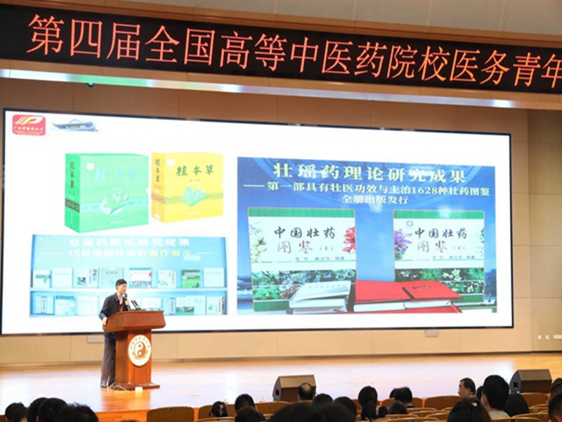 本次论坛以高等中医药院校附属医院管理、中医药传承创新、参与社会服务、临床实践教学创新和中医药科普工作成果为主线进行经验交流分享。开幕式上,何并文副书记做了主旨报告,我平台朱华、戴忠华主编的壮瑶药理论研究成果—第一部具有壮医功效与主治1628种壮药图鉴《中国壮药图鉴》及15部原创壮瑶药著作在第四届全国高等中医药院校医务青年发展论坛上隆重展示。