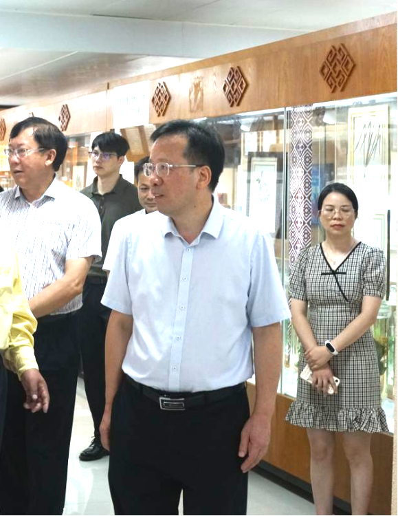 实验室负责人朱华博士教授介绍了平台建设情况,重点展示了壮瑶药理论与实践应用研究成果、科技奖项、中药资源普查标本库、壮瑶药标本数据中心以及自主研发的兰香草精油等产业化成果和团队编著出版的《壮瑶药研究》、《中药光照鉴定学》等前沿学术专著。莫锦荣书记和唐平秋书记充分肯定了我平台近年来所取得的成绩。我平台全体师生感谢领导的关怀与指导,一定要认真落实上级领导的指示精神,努力拼搏,把平台建设得更好,以实际行动推动广西中医药壮瑶医药高质量发展。广西民族大学党委常委、副校长何立荣,党委常委刘金林,点点体育党委办公室主任周德喜、中医药壮瑶医药研究院院长王孝勋等参加调研。