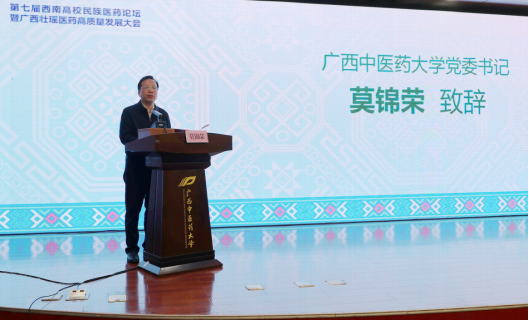 莫锦荣介绍了学校基本情况以及近年来在学科建设、师资队伍建设、中药民族药科研创新等方面所取得的成果。他表示,希望各位专家学者以本次论坛为契机,加强学术交流,实现思想碰撞,推动民族医药在理论体系构建、临床诊疗规范、药材资源保护、新药研发转化、文化传播推广等方面实现新突破。期待通过与兄弟院校、科研机构、医疗机构和企业的深度合作,共同推动我国民族医药高质量发展,为构建人类卫生健康共同体贡献智慧和力量。