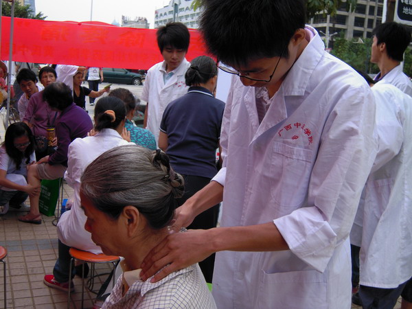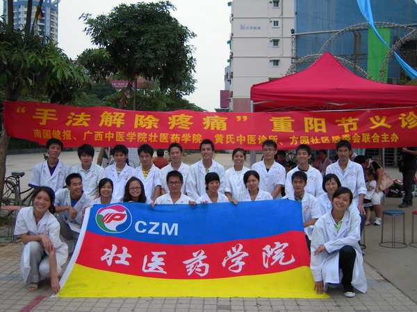 为了进一步弘扬尊老敬老优良传统,为老年人办实事、做好事,广西中医学院壮医药学院师生联合了南国健报、南宁市黄氏中医诊所一起,于2010年10月16日(重阳节)在方圆社区成功举办了一场以“手法调理老年人疼痛”为主题的大型壮医特色义诊活动。