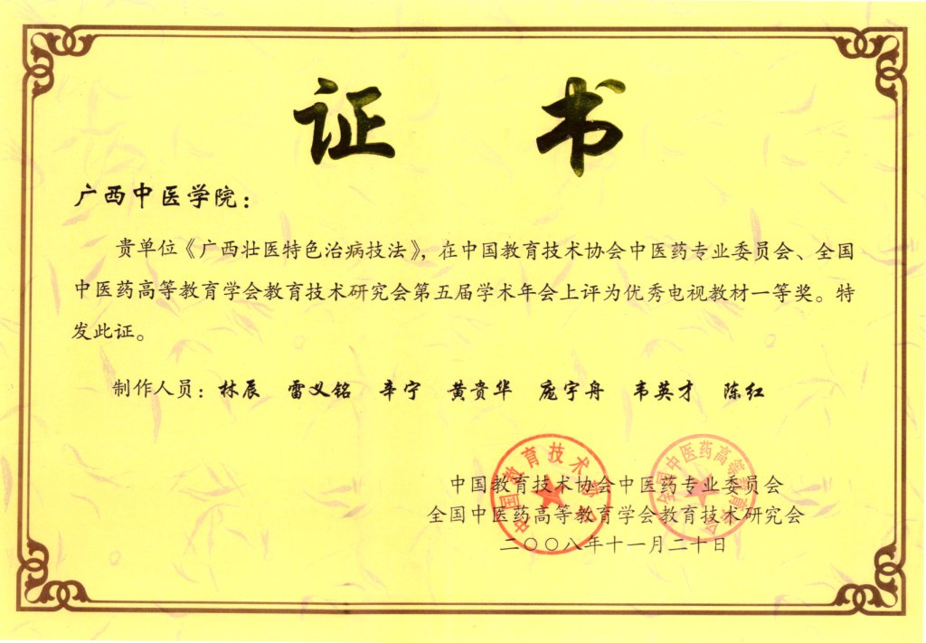 虽然壮医特色疗法教研室成立在后,但是《壮医特色疗法》、《壮医经筋学》的教材建设却从未停止过。2008年,收集整理广西民间壮医特色治病技法出版的视听教材《广西壮医特色治病技法》,获得2008年中国教育技术协会中医药专业委员会、全国中医药高等教育学会教育技术研究会第五届学术年会优秀电视教材一等奖。2008年壮医特色教材《壮医经筋疗法》获得自治区级重点教材立项,经过6年的精心酝酿,于2014年11月正式出版《中国壮医经筋学》。2012年,点点体育《壮医药系列教材》获全国中医药行业“十二五”规划教材立项,其中《壮医外治学》、《壮医经筋学》也作为““十二五”规划教材之一,教材编写整合、更新和优化起点低、陈旧、重复、形式单调、结构体系零乱的教学内容,突出教材综合性、设计性、创新性建设。充分挖掘壮医特色疗法、壮医经筋疗法资源优势,整合壮医药最新成果,以培养实用型特色人才为目标,修订新编壮医学教材突显壮医学简、便、廉、验的特点,现教材已编写完毕,待出版发行投入使用。