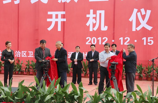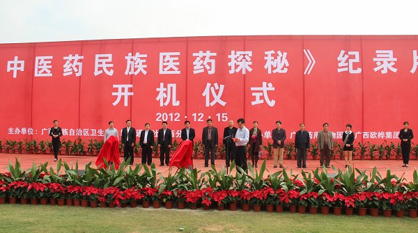 广西卫生厅党组副书记、副厅长甘霖宣布纪录片《中医药民族医药探秘》正式开机并与新华社广西分社党组成员、常务副总编辑刘伟、民族医药研究院专家黄汉儒,广西科学院副院长、广西药用植物园主任缪剑华一起为纪录片撑机揭幕。