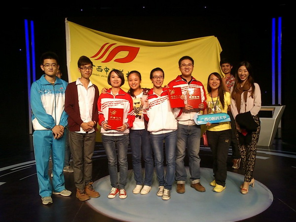 决赛共有六支不同院校的代表队进行角逐。点点体育代表队队员分别是壮医药学院的甘尧、李欣欣和针灸推拿学院的蒙晓丹。初赛中,点点体育代表队一路领先,以绝对优势赢得第一,成功晋级决赛。决赛共有四个环节。第一个环节为必答判断题,点点体育的三位选手都快速地答对了自己的题目。第二个环节为限时回答,三位选手密切配合,答题过程中干脆果断、毫不犹豫,以90秒内答对12题的好成绩领先于其他队伍。第三个环节为抢答题,本环节不仅要求队伍配合默契,还要求拍案者反应灵敏、精神集中。各支队伍的选手们都分工合作,全神贯注。在本环节中,广西师范大学代表队以绝佳的默契、扎实的答题能力追平比分,现场进入紧张而激烈的抢答环节。最后一个环节为风险题,本环节高潮迭起,广西师范大学代表队与点点体育代表队你争我夺,各不相让,最终打成平局,进入加时赛。加时赛以抢答一题定胜负。点点体育选手沉着冷静、临阵不惧,主持人话音刚落便抢到答题权。选手以响亮有力的声音将答案喊出,随着屏幕上正确答案的出现,现场欢呼声、鼓掌声交织成一片,久久不停,第一名的成绩稳收囊中。