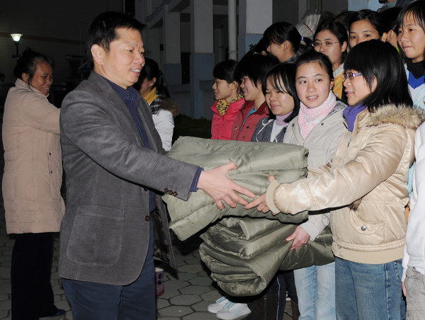 1月10日晚,壮医药学院领导和部分教师、学生干部一起,冒着寒风细雨,走访了学院学生宿舍,亲自查看了每位同学的防寒保暖情况,对家庭困难的同学进行了亲切的问候,倾听了他们的心声并做了详细记录。林院长安慰大家,困难是暂时,一定会有解决问题的办法。走访宿舍后,林院长立即召开了全体教职工会议,号召老师们发扬“一方有难,八方支援”的精神,送一床棉被,献一份爱心,集一份温暖,让同学们安心度过寒冬。