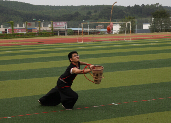 最受众人关注的是背篓接绣球活动。代表吉祥如意的绣球,在碧蓝的天空中画出彩色的弧线,赛场选手们背着箩筐追接绣球的搞笑姿势更是惹得周围观众笑声连连,足球场瞬间变成了欢乐的海洋。