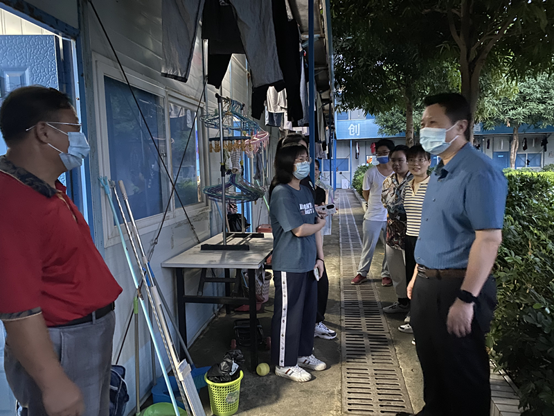 庞宇舟教授一行深入到实习生的宿舍区和学习教室,实地考察了同学们的居住环境和学习环境。在与实习生交谈时,他对同学们认真的学习态度、扎实的专业知识以及良好的壮医技法操作能力给予了充分的肯定。同时勉励同学们要珍惜实习机会,虚心学习;现在是疫情常态化防控期,希望大家做好防控,认真完成实习任务。