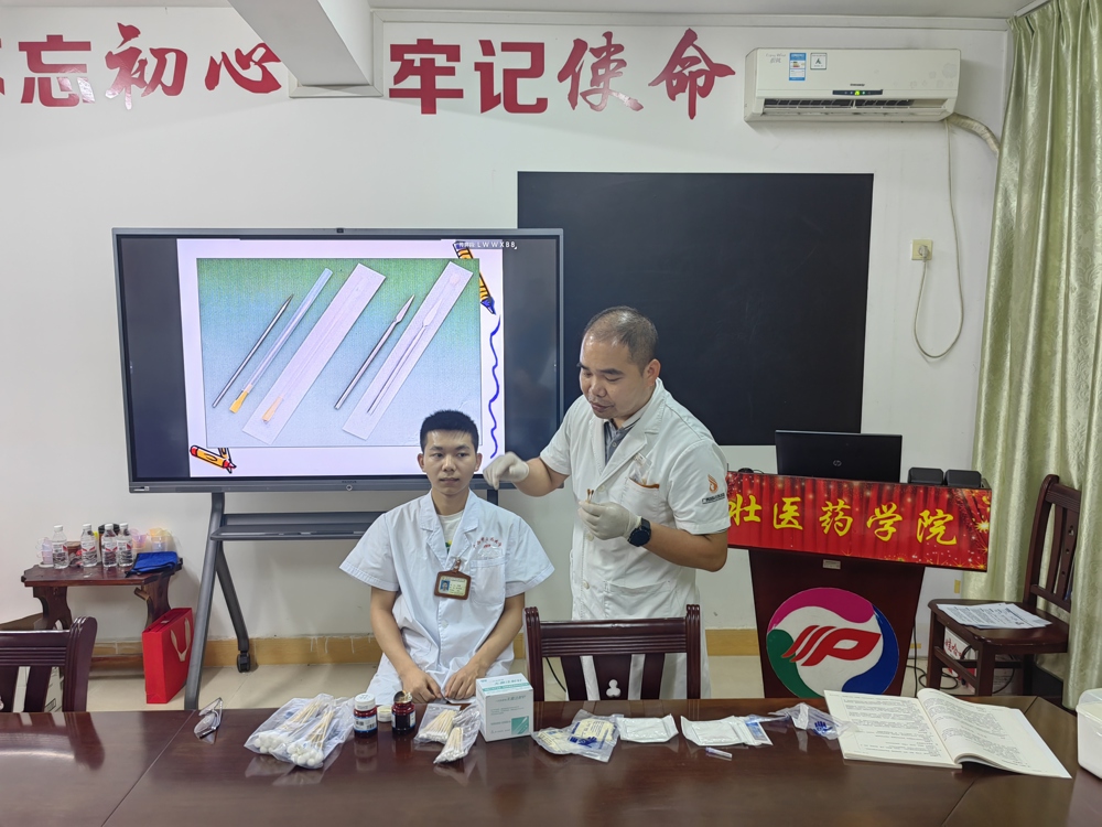 活动中,学院5名教师结合自己实际授课分别展示了各自教学内容,通过设置具体情境,引导大家合作探究,积极讨论。宋宁讲授了《壮医药学概论》理论课程,郑春莉讲授了《壮医滚蛋疗法》、梁子茂演示了《壮医放血疗法》实践操作、李晶晶分享了《壮医技法考核》知识点,刘儒鹏展示了《壮医诊断微视频摄制》操作方法。