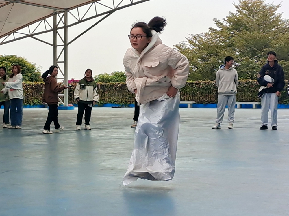 在袋鼠跳活动中,同学们给双腿套上麻袋,模仿袋鼠的姿势双腿齐跳前进,或兔子般轻盈可爱,或猛兽般势如破竹,小小的麻袋阻挡不了他们一往无前的气势,在你追我赶的竞速中,青春的激情肆意挥洒。