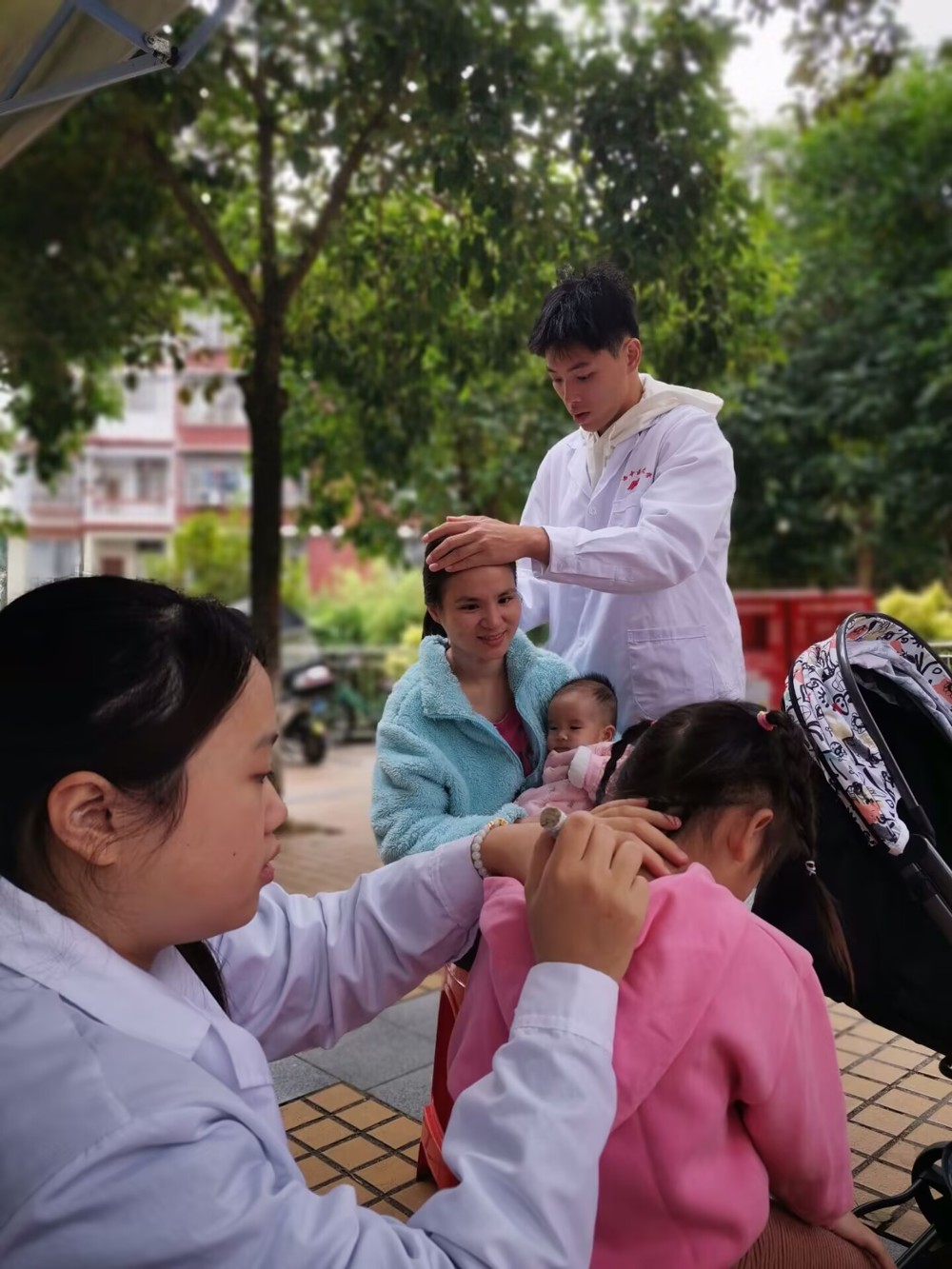 协会成员按照任务分配有序开展相关的义诊项目,为社区居民们应用壮医热敏探穴针刺疗法、壮医经筋疗法、宫廷理筋术、壮医药线点灸、壮医火攻疗法等极富壮医特色的疗法进行服务。